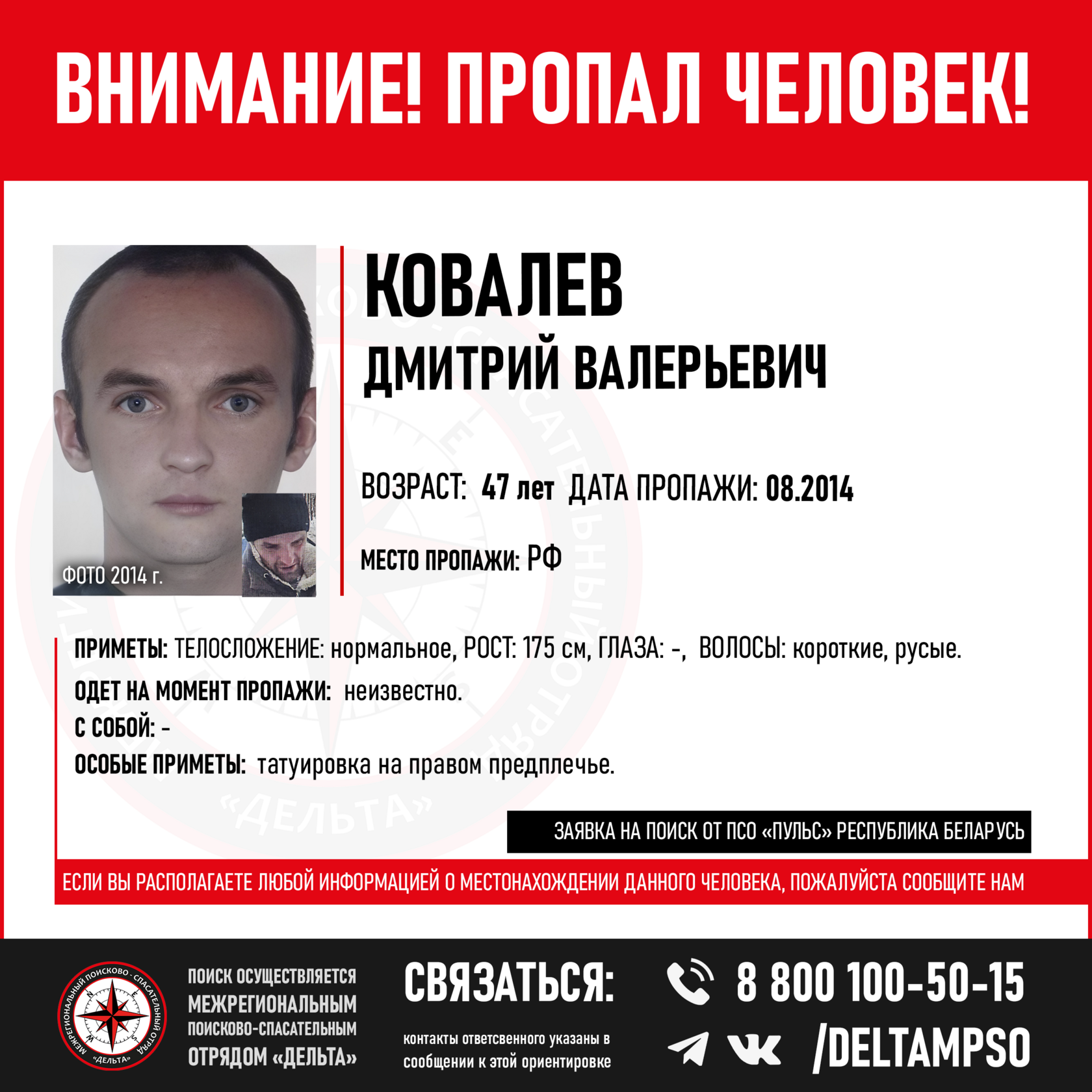 47 лет. Пропал в августе 2014 в г. Кострома. Может находиться: на территории г. Москва или Московской области.