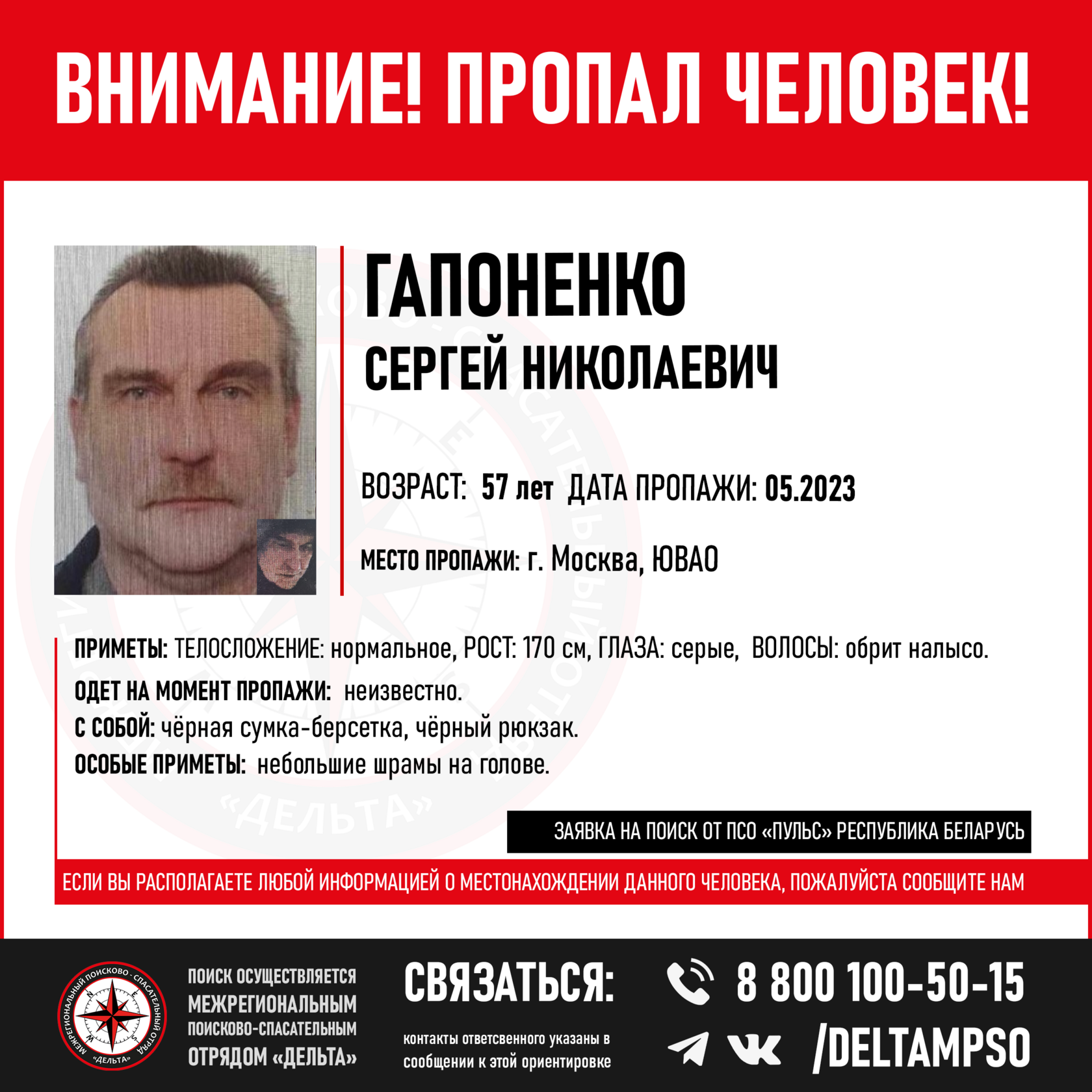 57 лет. Пропал в мае 2023 в г. Москва.